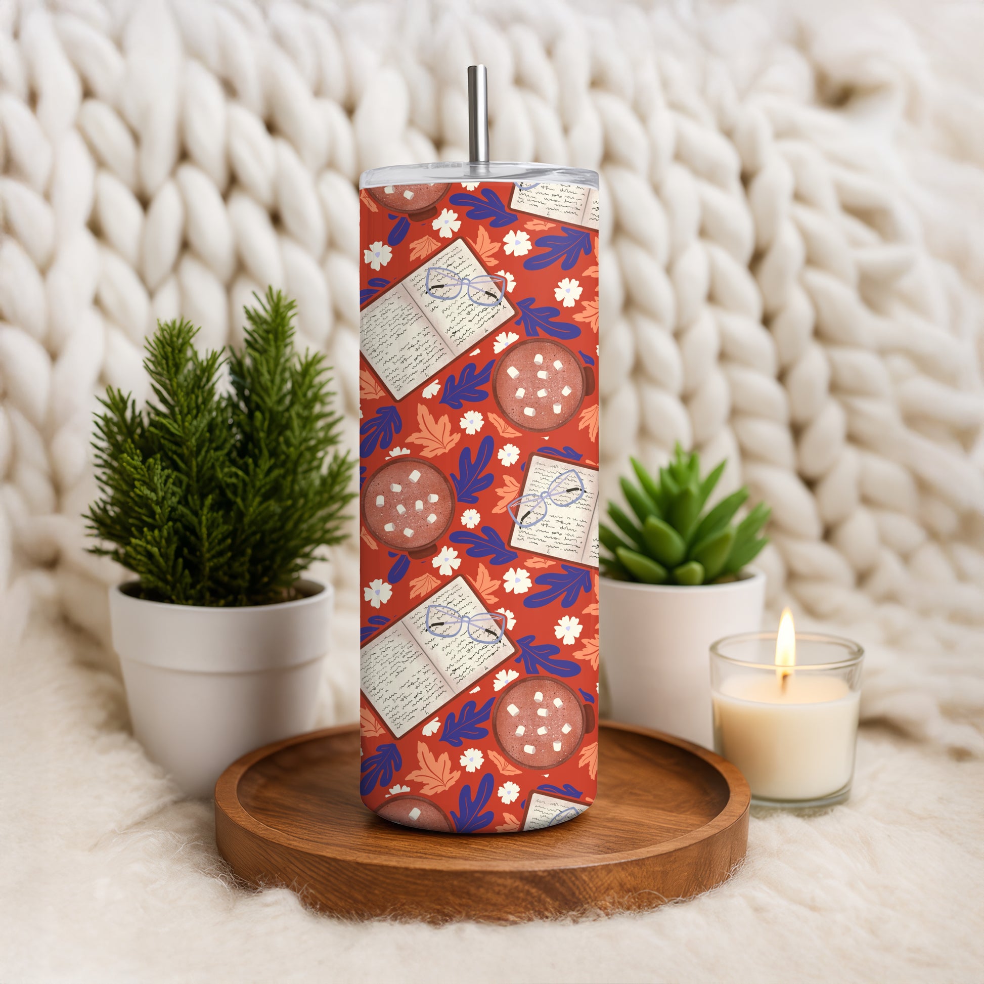 Cozy Fall 20 oz Tumbler Wrap Red β Books, Hot Cocoa & Fall Florals PNG | Digital 9.25β x 8.20β