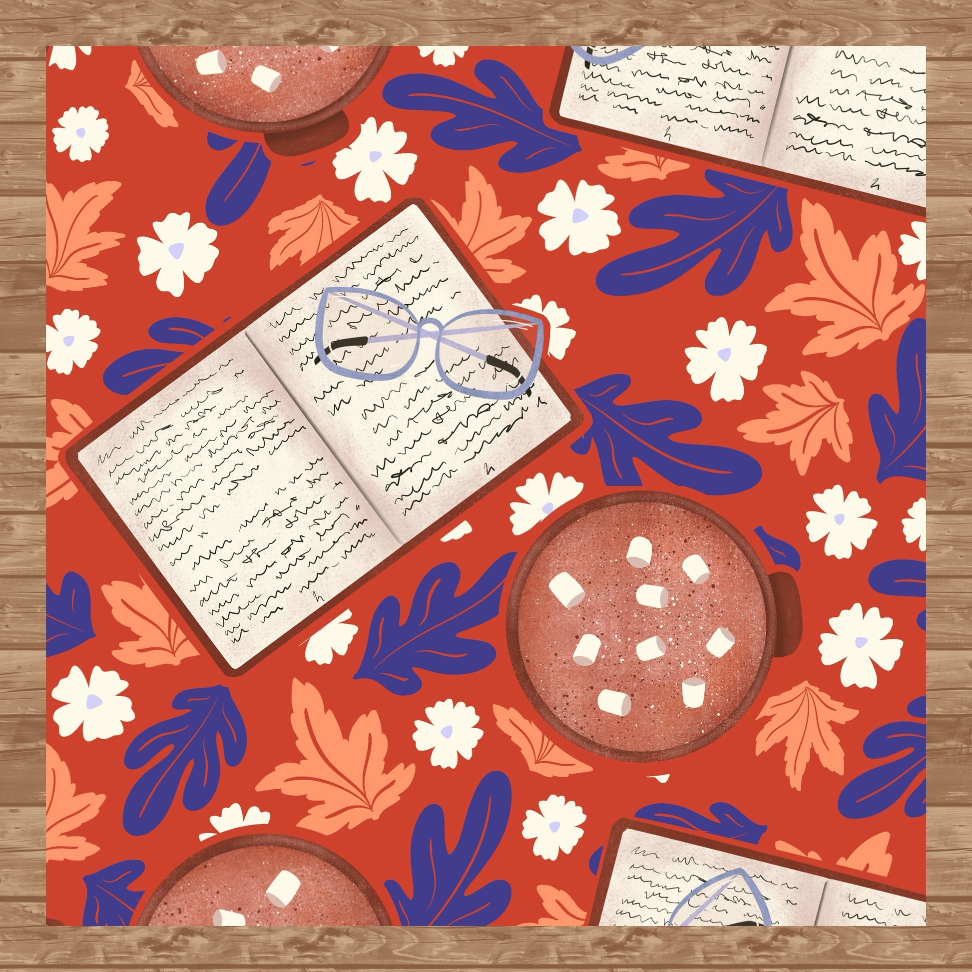 Wrap your next creative project in cozy autumn charm with this fall-themed seamless pattern featuring books, steaming mugs of hot cocoa, reading glasses, and golden leaves. Perfect for adding that warm and inviting seasonal touch to your designs, this pattern brings the essence of fall directly to your fingertips.