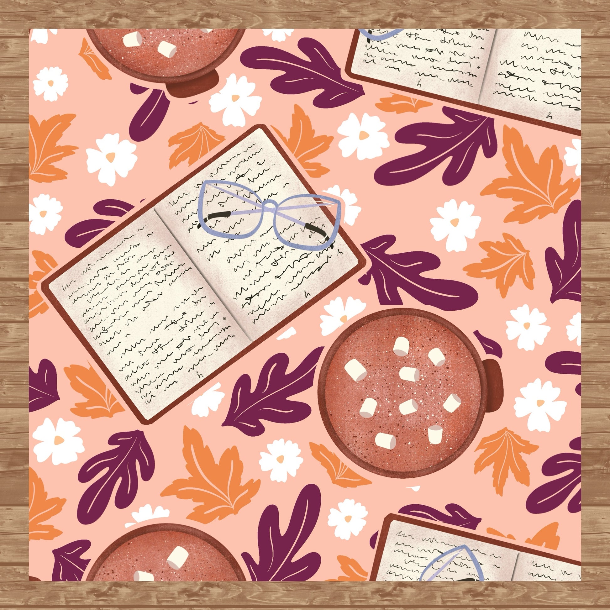 Wrap your next creative project in cozy autumn charm with this fall-themed seamless pattern featuring books, steaming mugs of hot cocoa, reading glasses, and golden leaves. Perfect for adding that warm and inviting seasonal touch to your designs, this pattern brings the essence of fall directly to your fingertips.