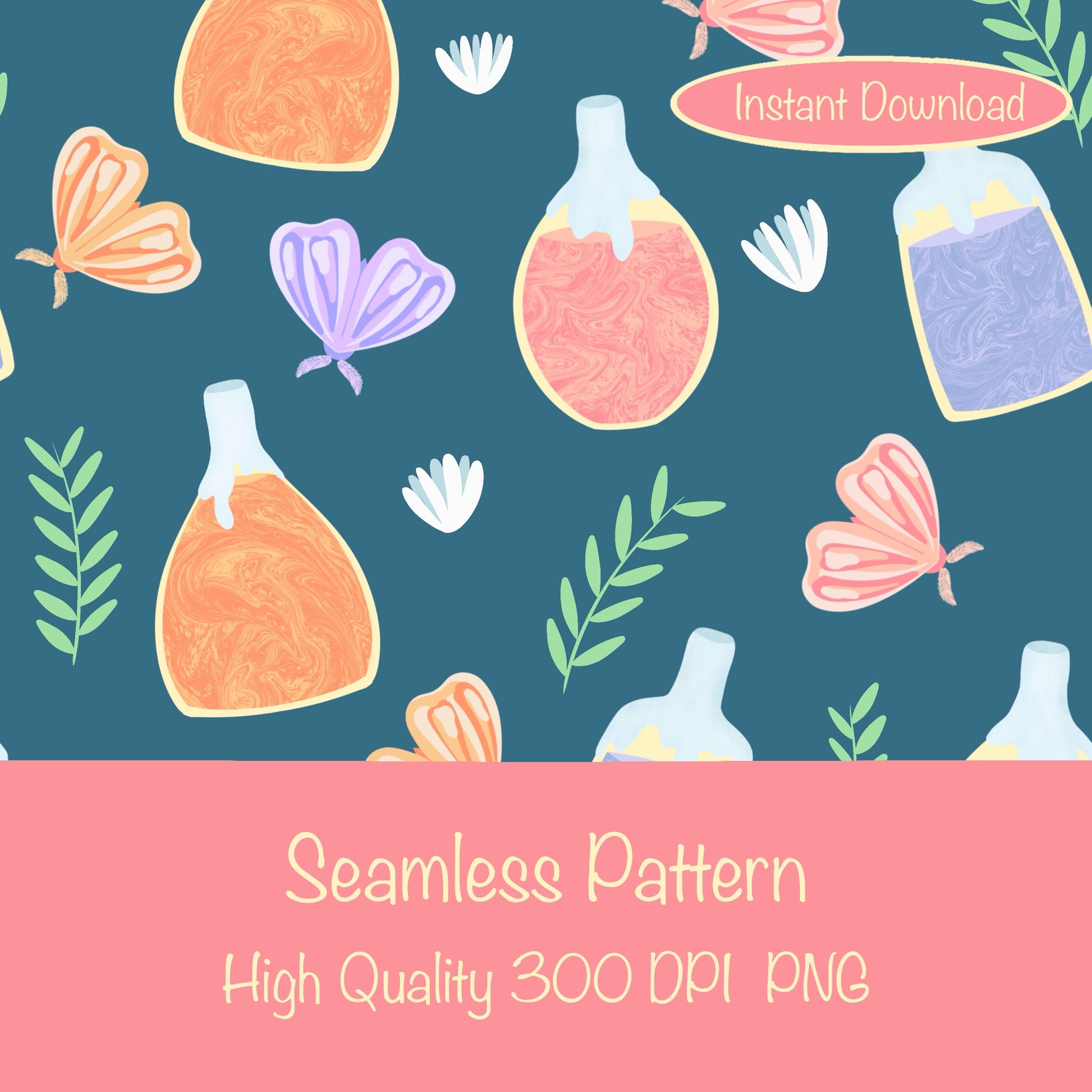 With instant download, you can start creating the moment you purchase. Whether you’re building your brand, making magical crafts, or designing unique products, this enchanting seamless pattern is ready to spark your imagination. 🧪🦋🌸