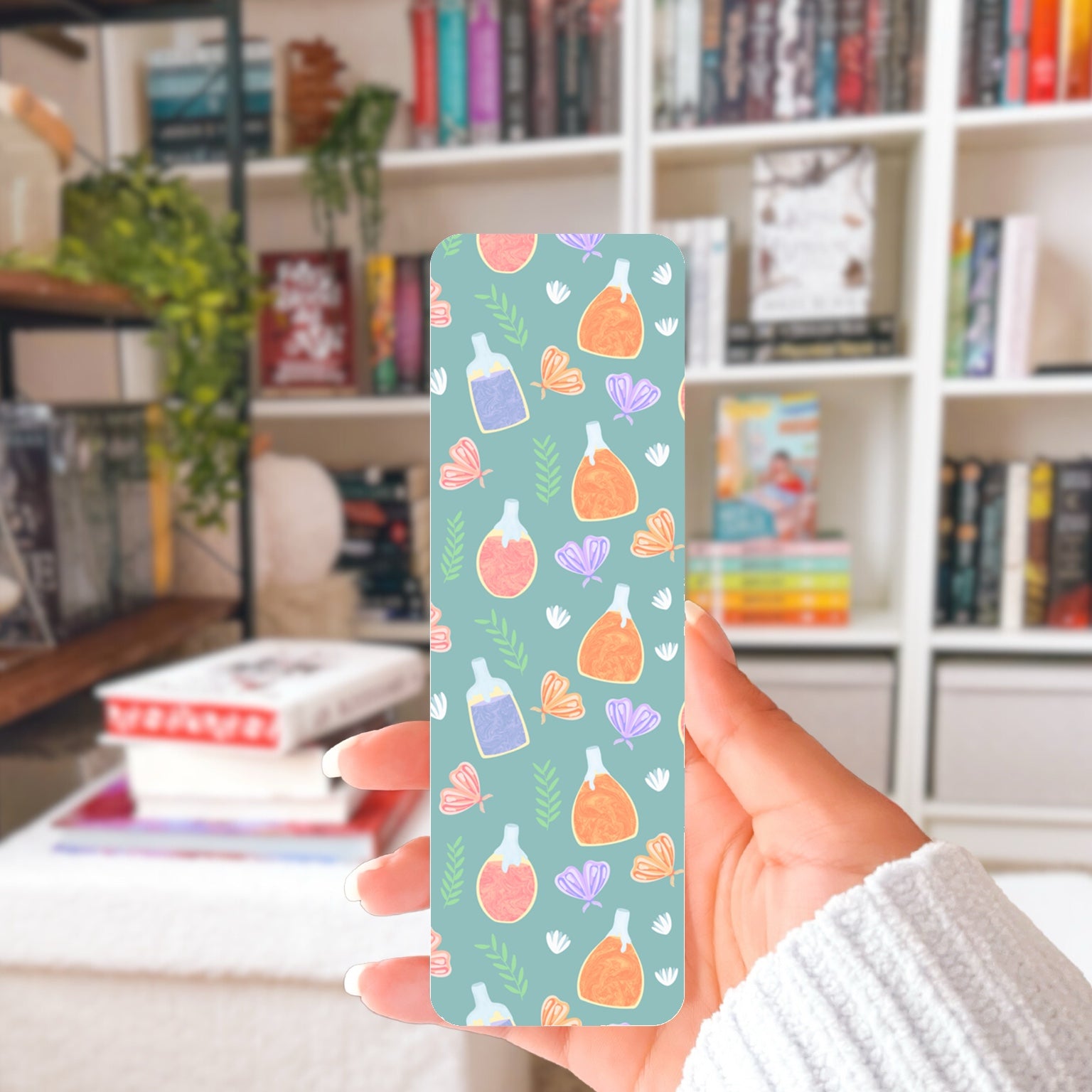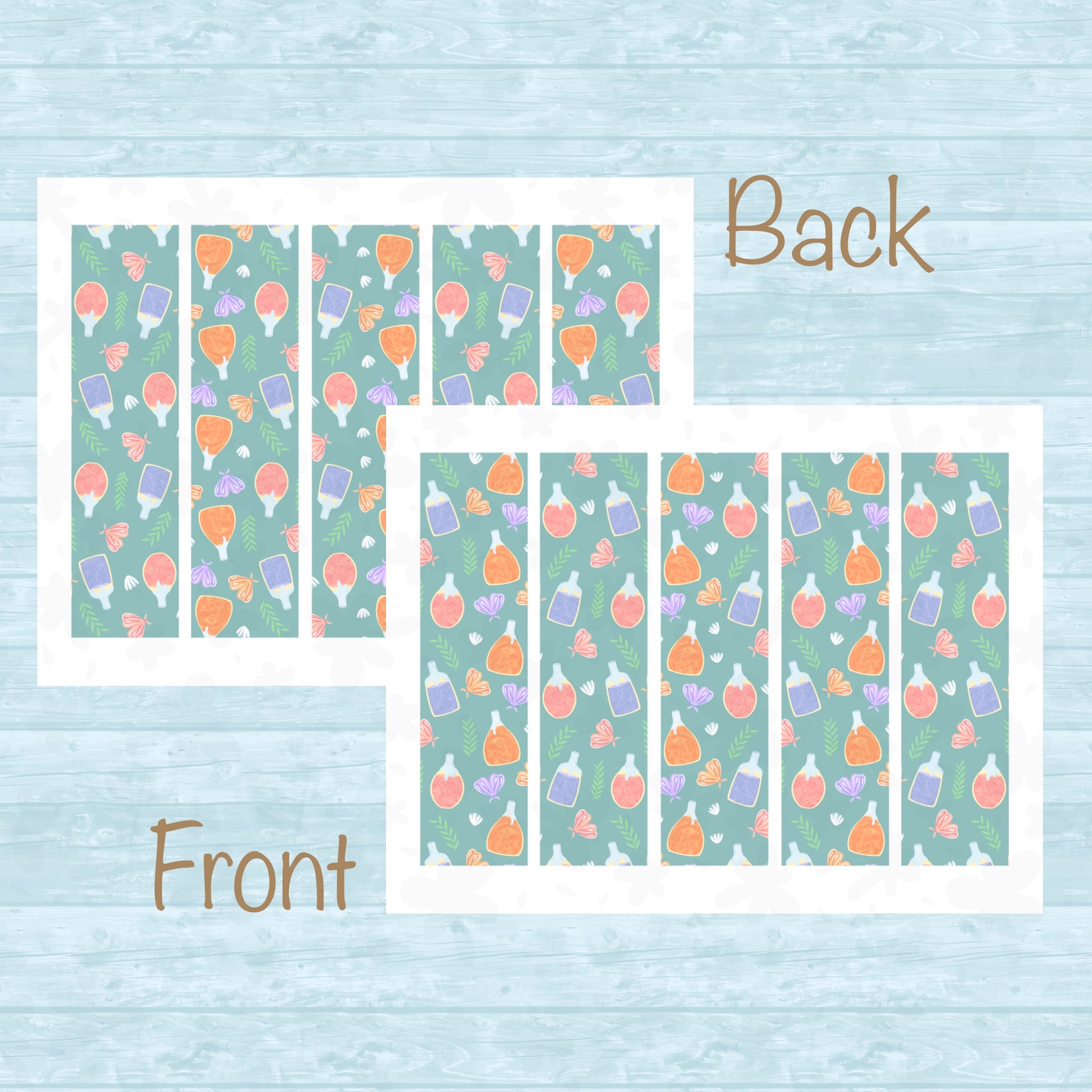 Whimsical Printable Bookmark with Flowers, Moths & Potions Green โ Digital Download | 2 PDF Files, 2x7โ at 300 DPI | Commercial Use