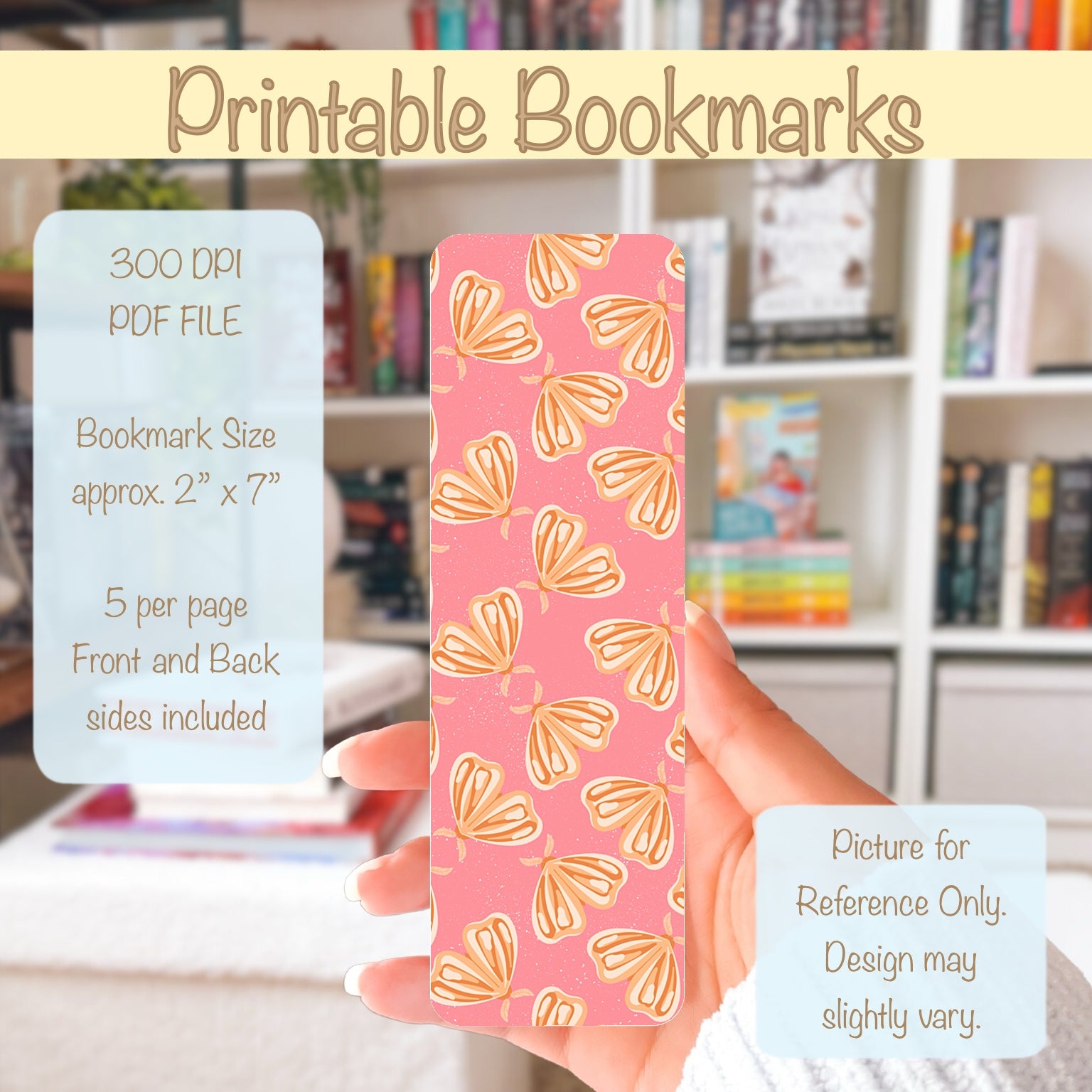 Whimsical Printable Moth Bookmark Pink β Digital Download | 2 PDF Files, 2β x 7β at 300 DPI | Commercial Use